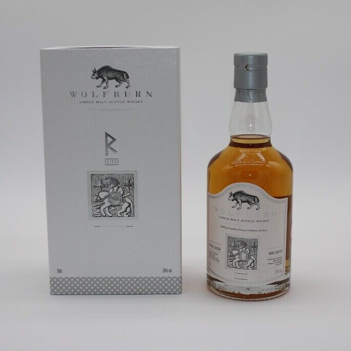 The Wolfburn Kylver Series - Release 5 is the fifth installment in Wolfburn's esteemed Kylver Series. This release is named after the fifth runic letter in the Kylver alphabet, "Raidho," which translates to "to ride" or "journey". This edition is a blend of whisky matured in first-fill bourbon barrels and Pedro Ximénez sherry casks, resulting in a rich and complex flavor profile. It has an alcohol content of 50% ABV. This release is limited to 960 bottles, making it a prized addition for collectors and whisky enthusiasts.
