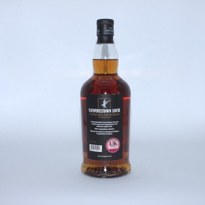 Campbeltown Loch Blended Malt Scotch Whisky is a delightful blend features malts from three local distilleries: Springbank, Glen Scotia, and Glengyle. It offers a unique blend of maritime coastal notes, sweet peat, soft fruits, and spice. The nose reveals buttery notes, sea salt, ginger loaf, and pecan pie. The palate is creamy with coffee, salted caramel, date syrup, and crystallized brown sugar, complemented by subtle peat smoke. The finish is marked by peat smoke, leathery notes, and a touch of seaweed salinity. Matured in a combination of ex-bourbon and ex-sherry casks, it boasts an ABV of 46%.