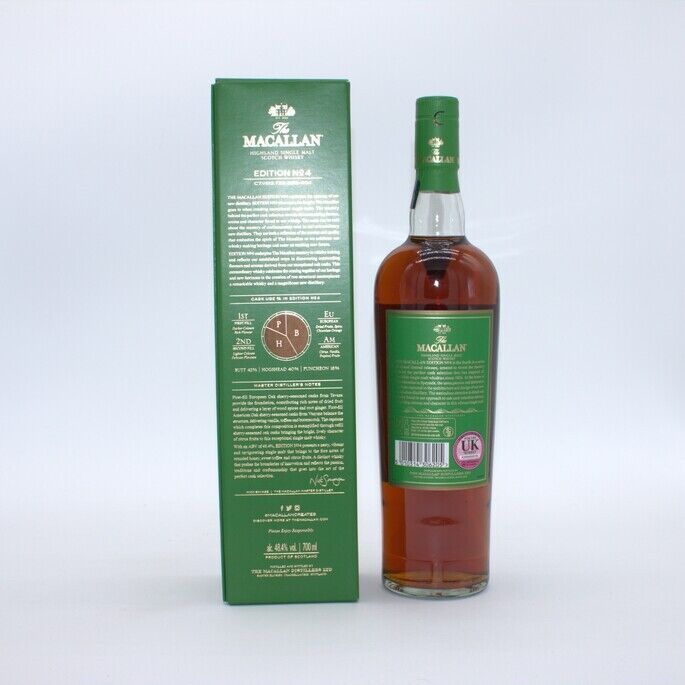 The Macallan Edition No. 4 is the fourth release in Macallan's Edition Series, celebrating the craftsmanship and pioneering design of the new Macallan Distillery. This whisky is crafted from a combination of European and American oak casks, showcasing the mastery of whisky making since 1824.