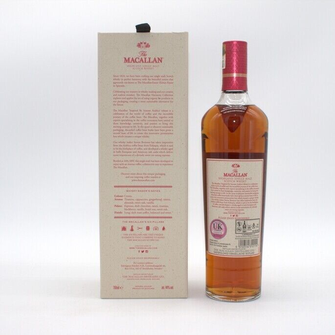 The Macallan Harmony Collection Intense Arabica is a limited annual release inspired by the Ethiopian Arabica bean, known as the birthplace of coffee. This special single malt whisky is crafted to exude flavours of espresso, dark chocolate, and sweet oak.