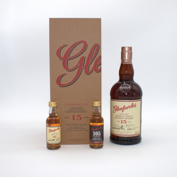 An exceptional gift set from Glenfarclas, featuring a 70cl bottle of 15-year-old single malt, along with 5cl bottles of the 105 Cask Strength and 25 Year Old. It's a fantastic opportunity to savour drams from one of Speyside's most loved distilleries!