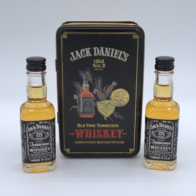 Two miniature bottlings of Old No.7 from the 1990s, presented in a tin gift box.